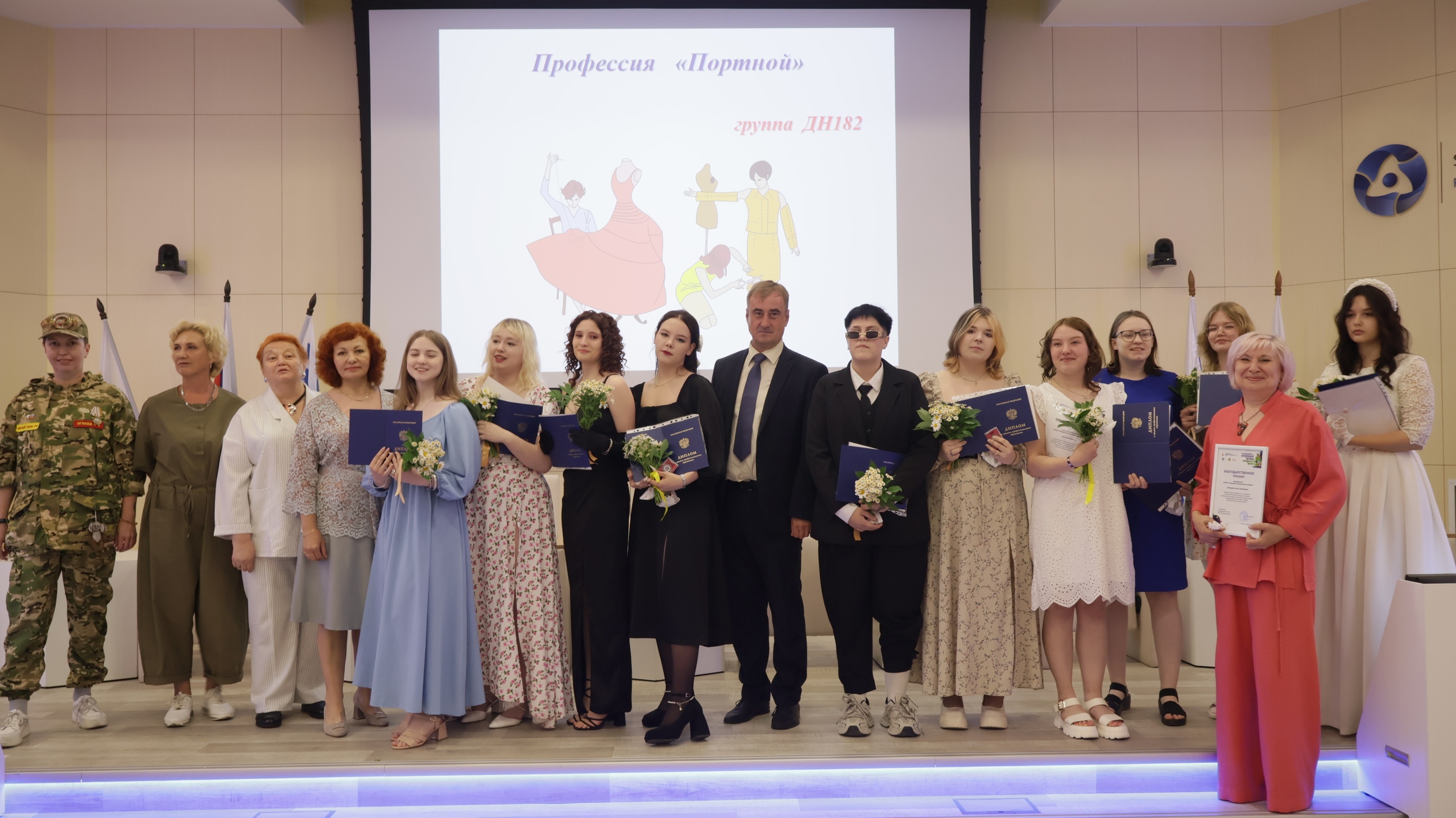 Выпускникам групп ДН182 и ДН183 (профессия – «Портной») председатель Томской региональной общественной организации «Военно- патриотический центр "Мирный воин"» Огнева Ольга Владимировна и помощник депутата Законодательной Думы Ларионова Светлана Владимировна вручили благодарности за волонтерскую работу (пошив вещей для участников СВО).