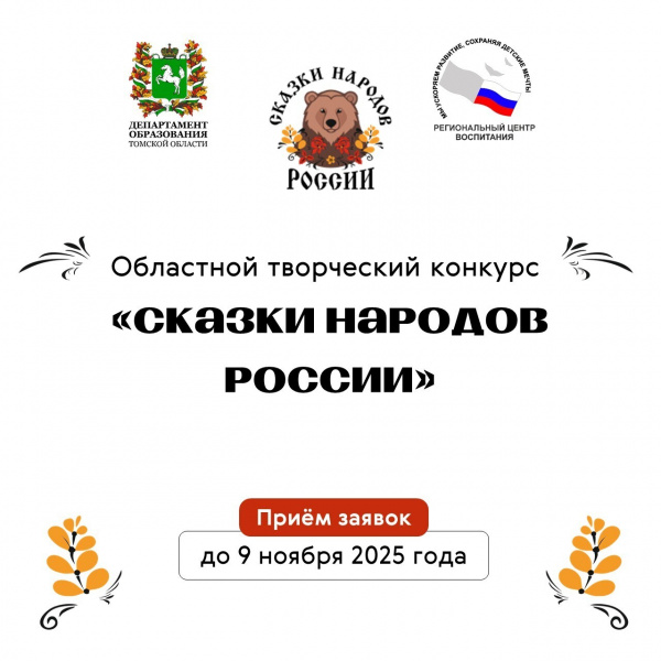 Подробнее о Конкурсе можно узнать в Распоряжении Департамента образования Томской области от 04.07.2025 № 1071 «О проведении областного творческого конкурса «Сказки народов России» для обучающихся образовательных организаций Томской области, включая детей с ограниченными возможностями здоровья и инвалидностью» >>>